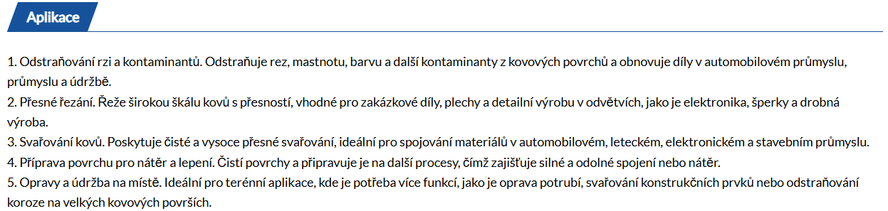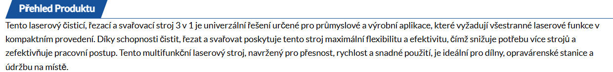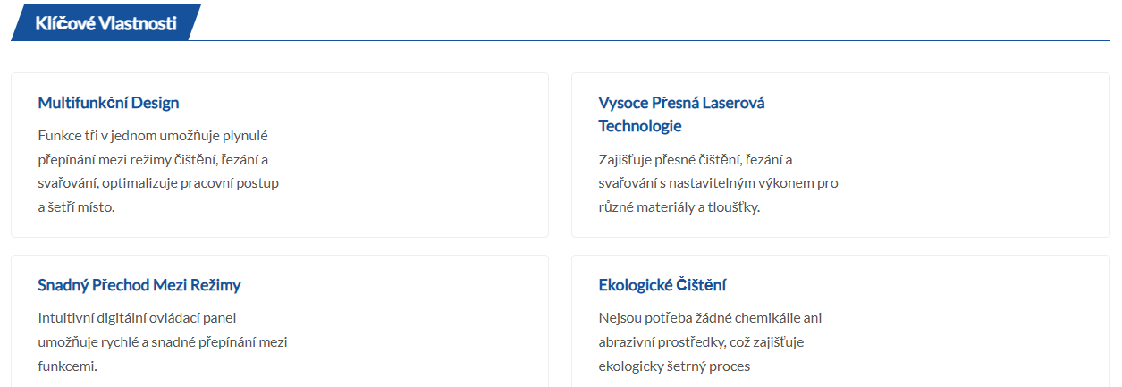 Tento laserový čisticí, řezací a svařovací stroj 3 v 1 je univerzální řešení určené pro průmyslové a výrobní aplikace, které vyžadují všestrannou laserovou funkcionalitu v kompaktním provedení.