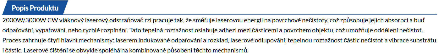 Stroj na odstraňování rzi s vláknovým laserem o výkonu 1500W 2000 W a 3000 W pracuje tak, že směřuje laserovou energii na povrchové nečistoty, což způsobuje, že tyto absorbují energii a buď se odpařují, vypařují nebo rychle expandují.